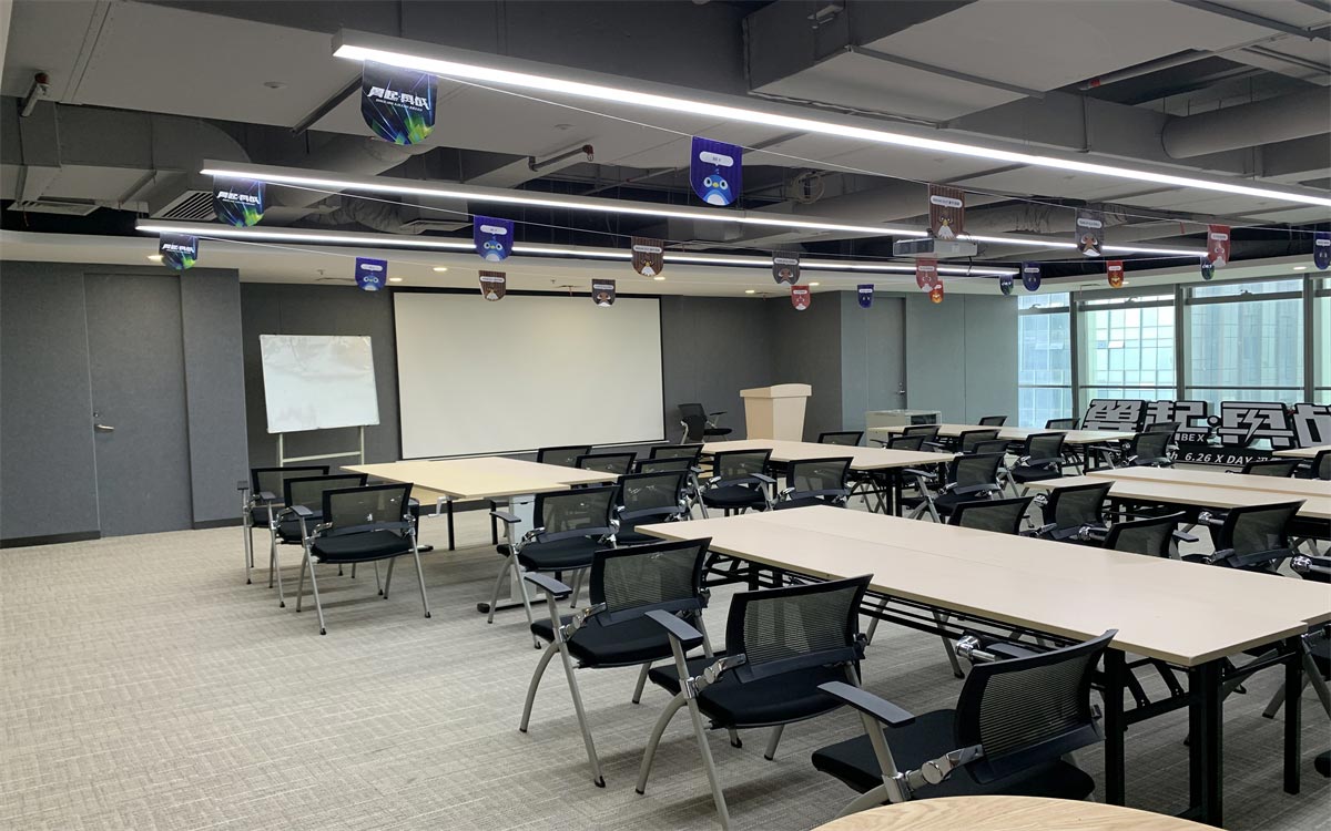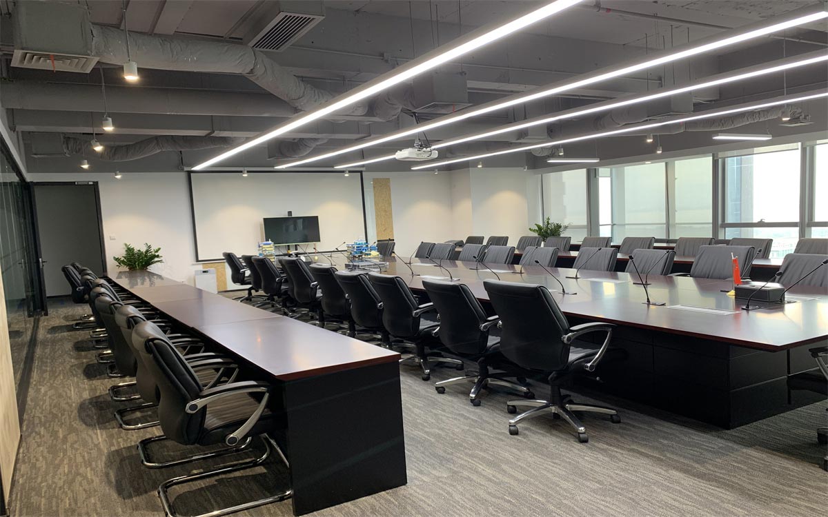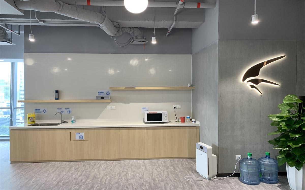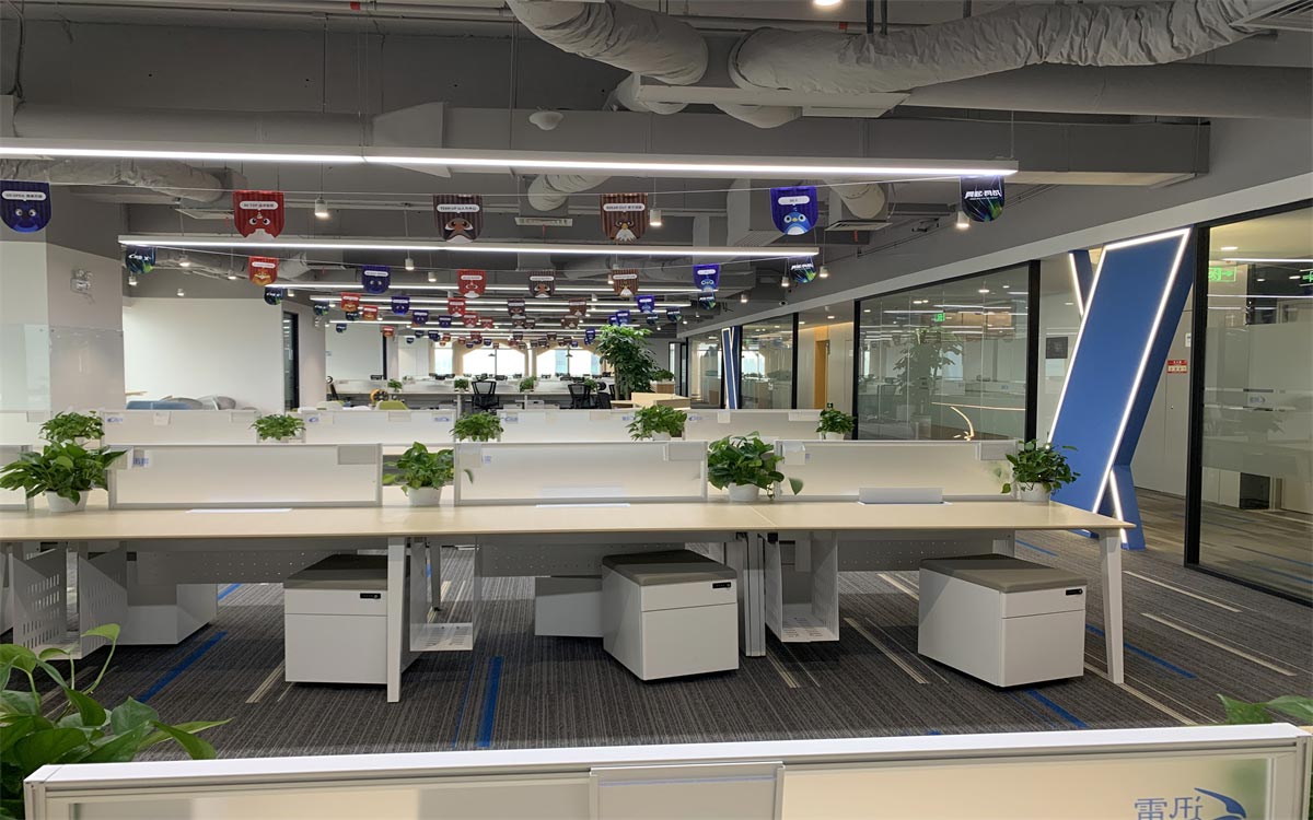 前臺采用簡潔明了的LOGO,搭配暖色系燈帶和臺面材料,打破網(wǎng)絡(luò)科技公司的刻板印象,營造一種溫馨的辦公氛圍。線條感的地毯從視覺上給人一種速度感,代表迅雷下載服務(wù)的追求。