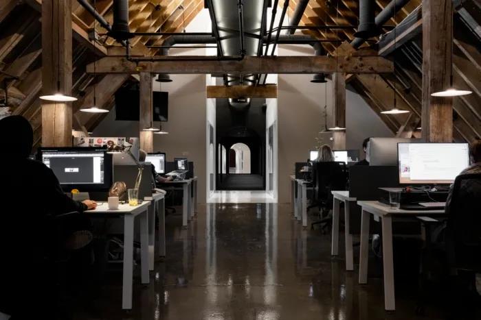 除了解決狹窄、局促和線性空間的問題,ACDF在重新設(shè)計傳統(tǒng)建筑時還面臨著一些固有的限制,包括監(jiān)管問題。為了滿足緊急出口的要求,該公司為6樓會議室建造了一個新的疏散走廊,穿過暴露的閣樓木結(jié)構(gòu),以連接到現(xiàn)有的出口。進(jìn)一步的挑戰(zhàn)涉及到與基地建筑建筑師合作開發(fā)的外部屋頂保溫策略,允許裸露的屋頂內(nèi)部木梁保持空間設(shè)計的一部分。該公司還以一種創(chuàng)新的方式,通過設(shè)計和實施環(huán)境照明策略,解決了自然光滲透受限的問題。